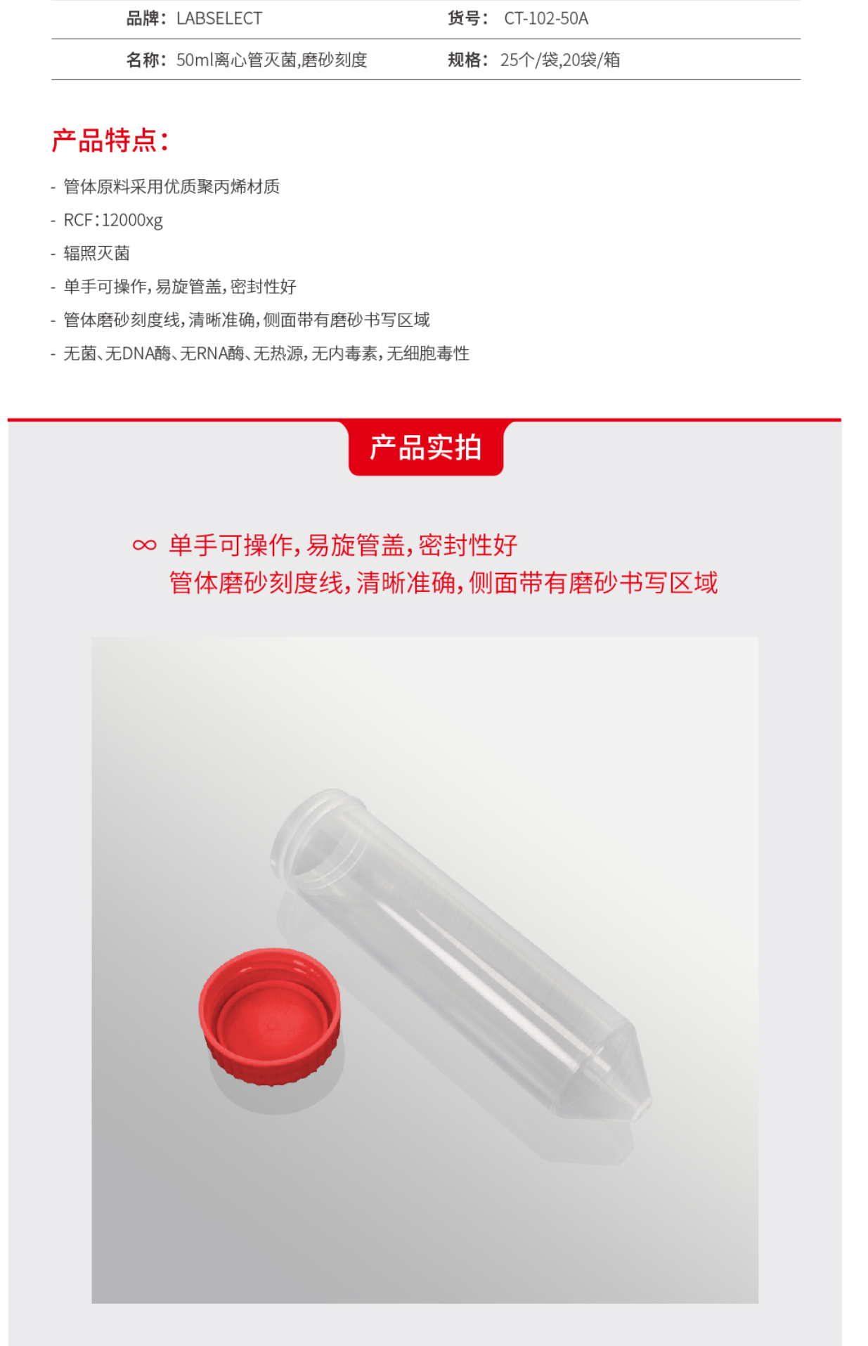 | CT-102-50A | 50ml,灭菌, 磨砂刻度 | 包装说明:25支/包,20包/箱 |