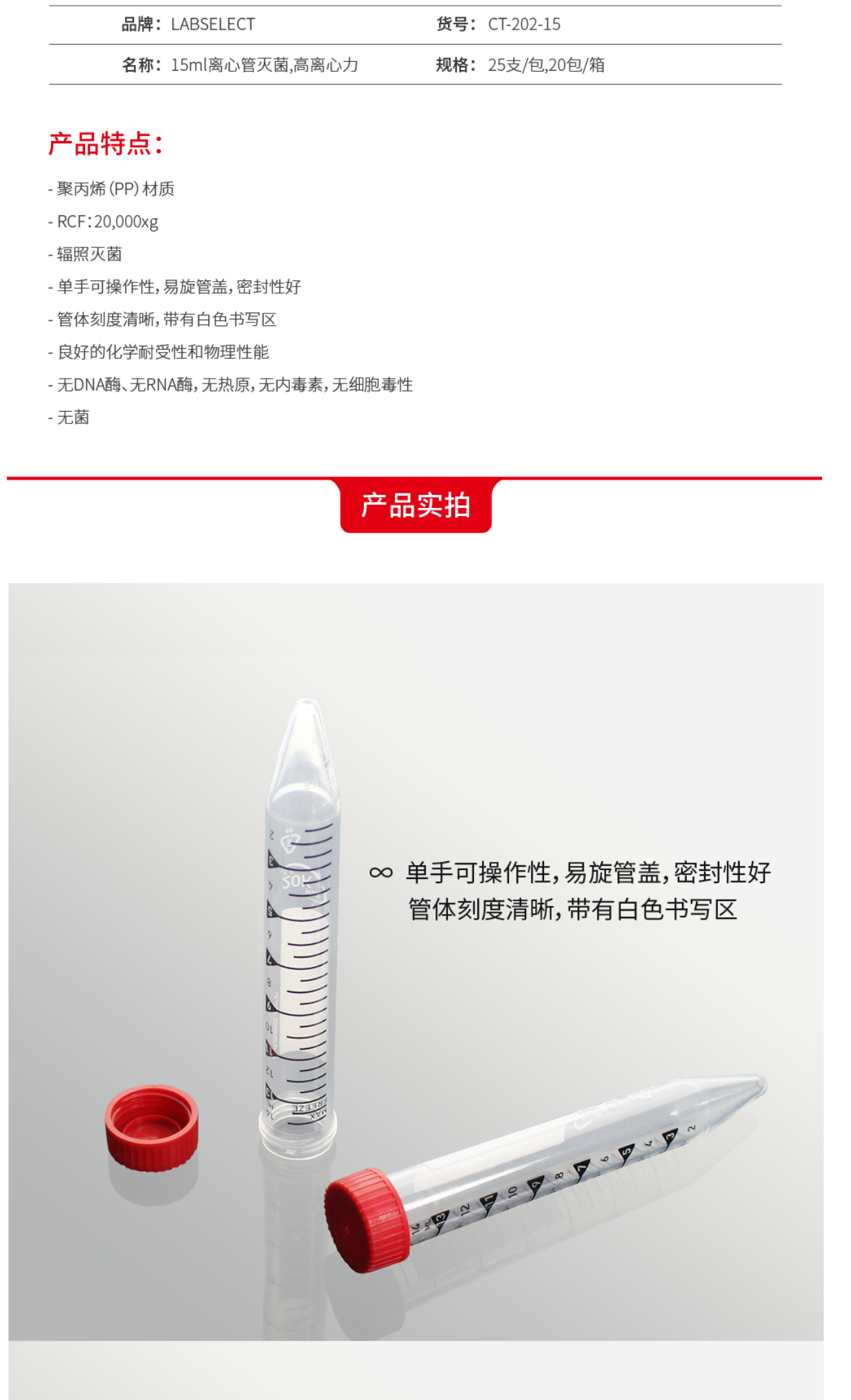 | CT-202-15 | 15ml,灭菌, 高离心力 | 包装说明:25支/包,20包/箱 |