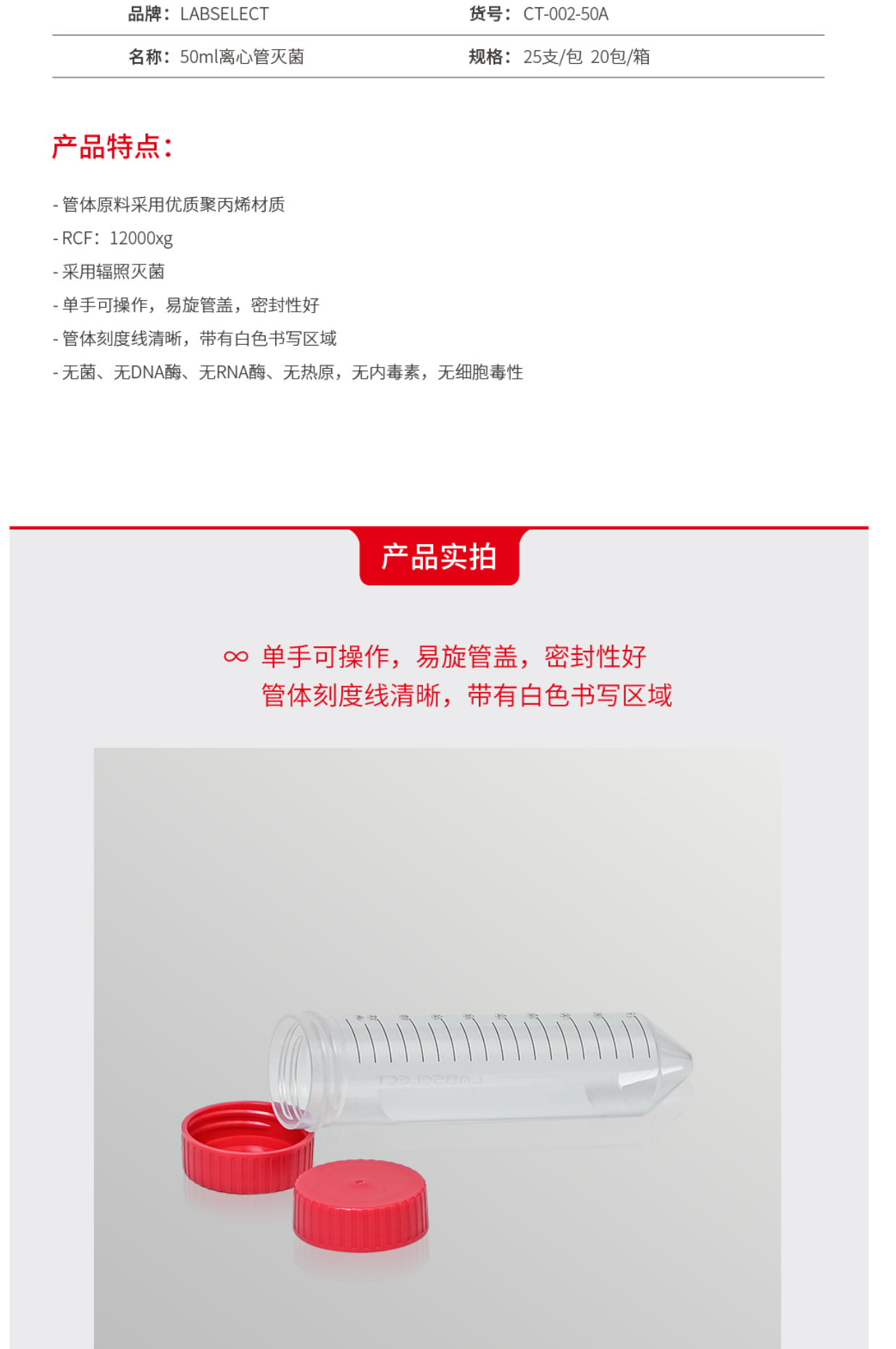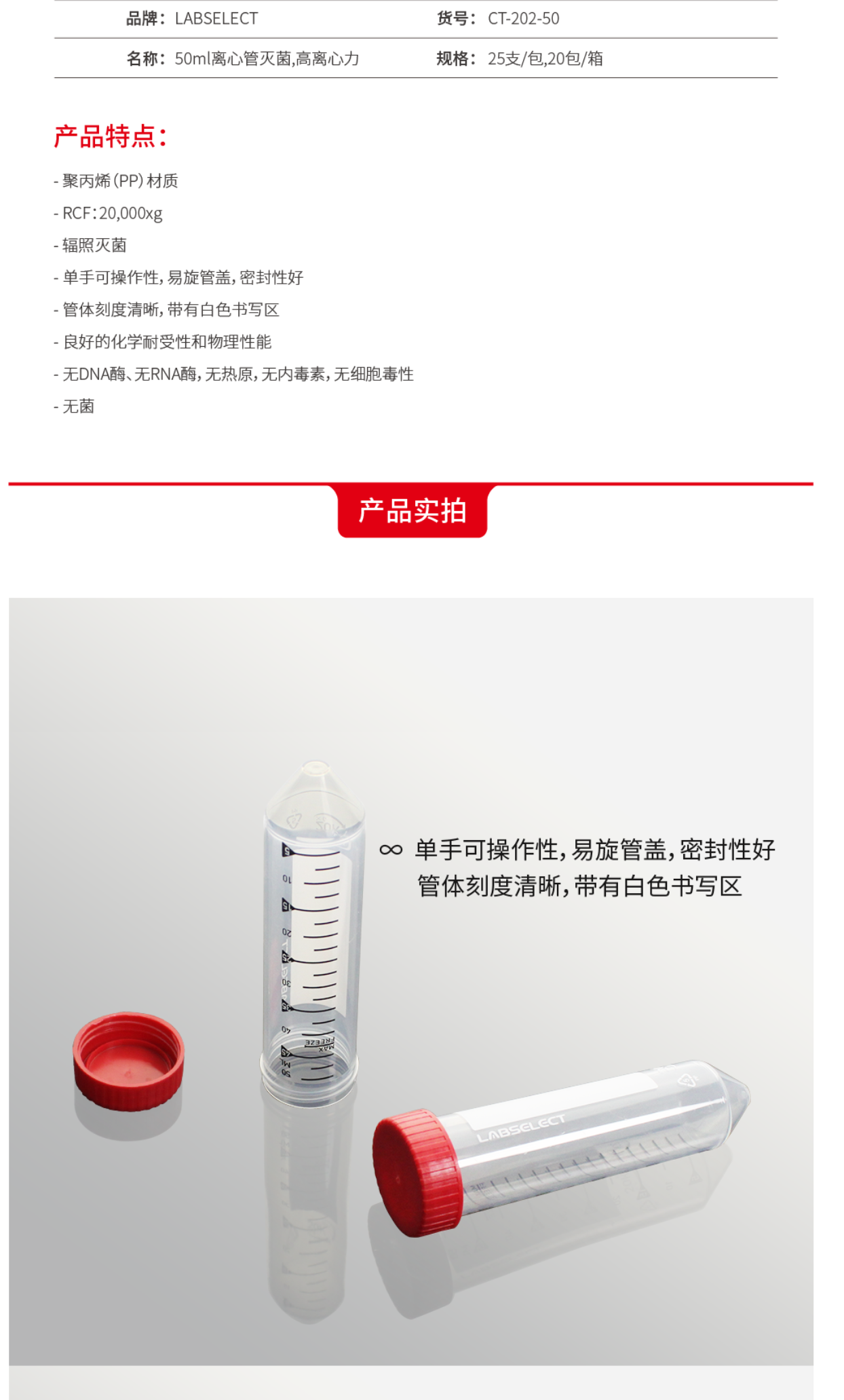 | CT-202-50 | 50ml,灭菌, 高离心力 | 包装说明:25支/包,20包/箱 |