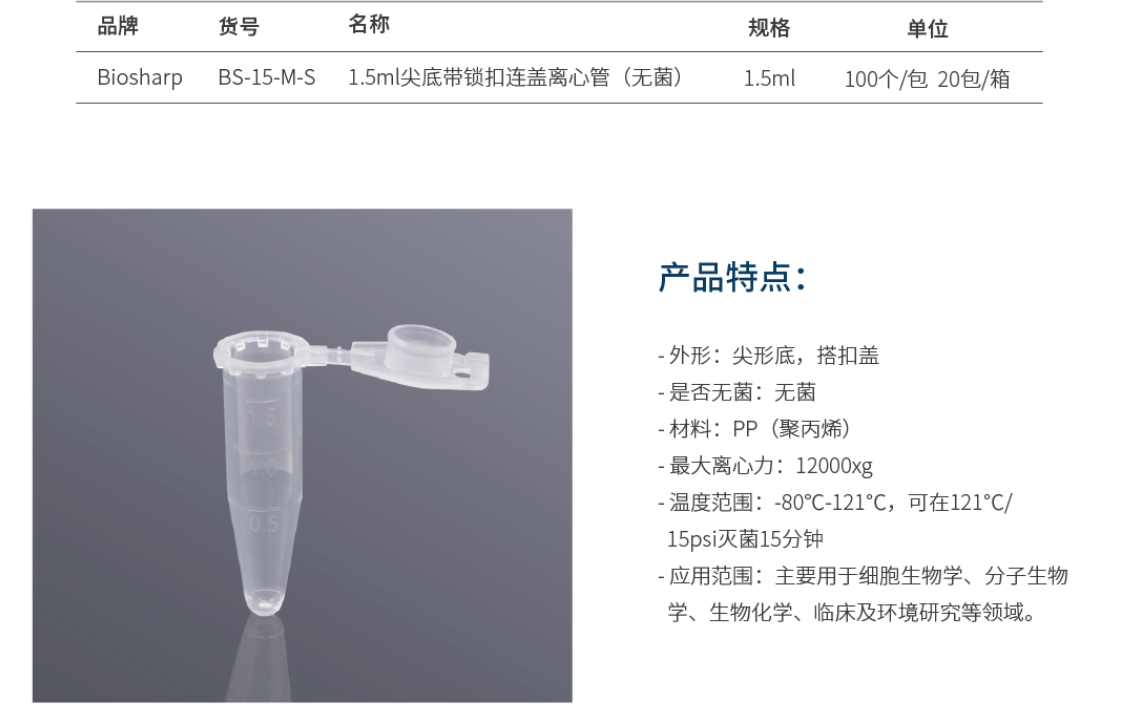 | BS-15-M-S | 1.5ml,尖底,连盖,无菌 | 包装说明:100支/包,20包/箱; biosharp |