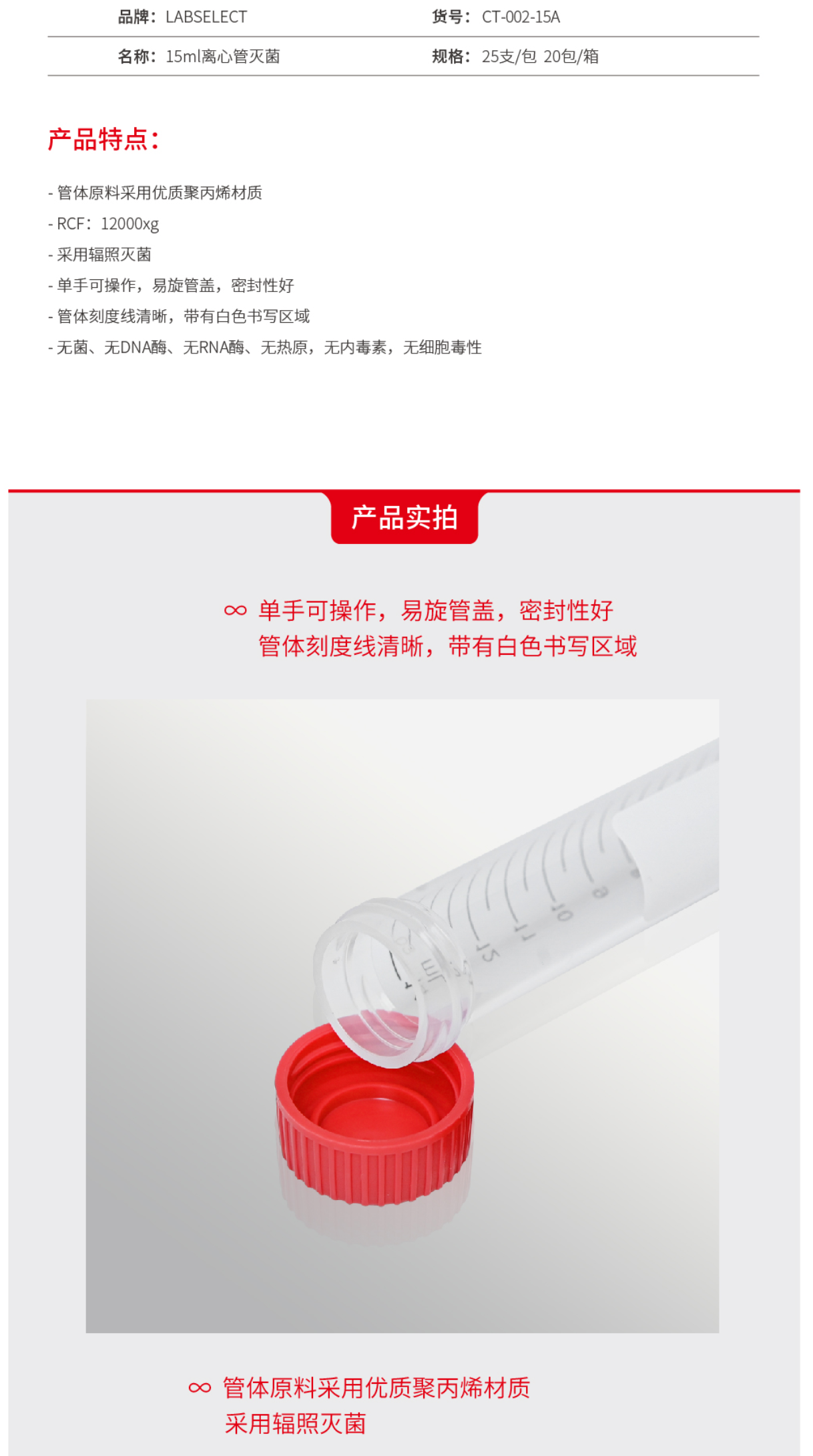| CT-002-15A | 15ml,灭菌 | 包装说明:25支/包,20包/箱 |