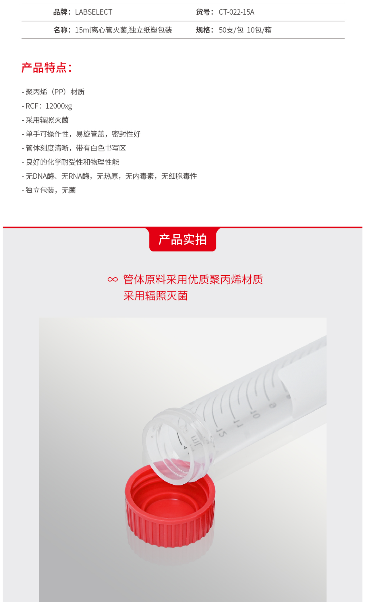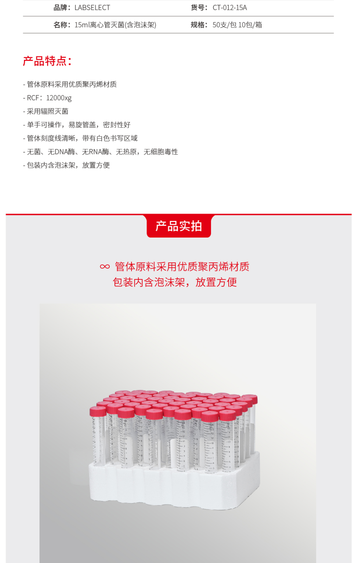 | CT-012-15A | 15ml,灭菌,含泡沫架 | 包装说明:50支/包,10包/箱 |