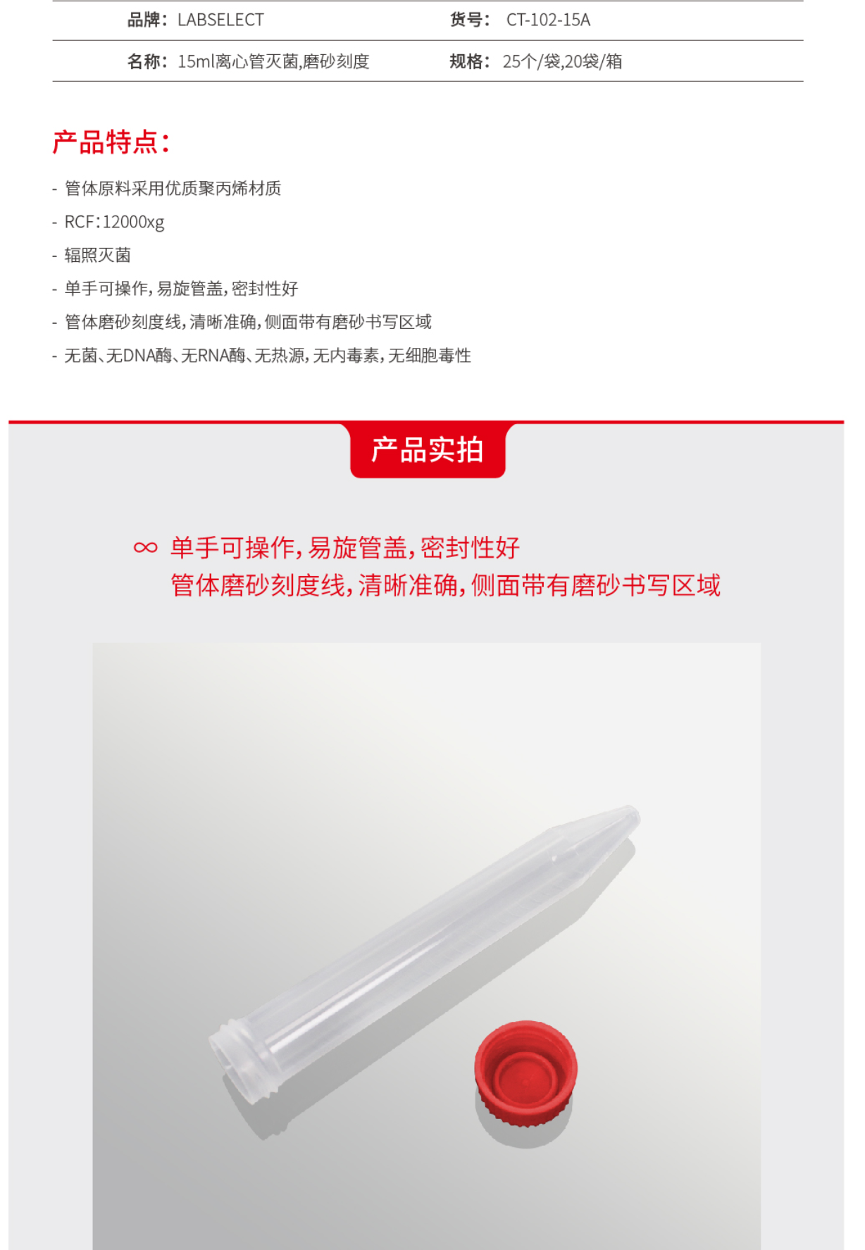 | CT-102-15A | 15ml,灭菌,磨砂刻度 | 包装说明:50支/包,10包/箱 |