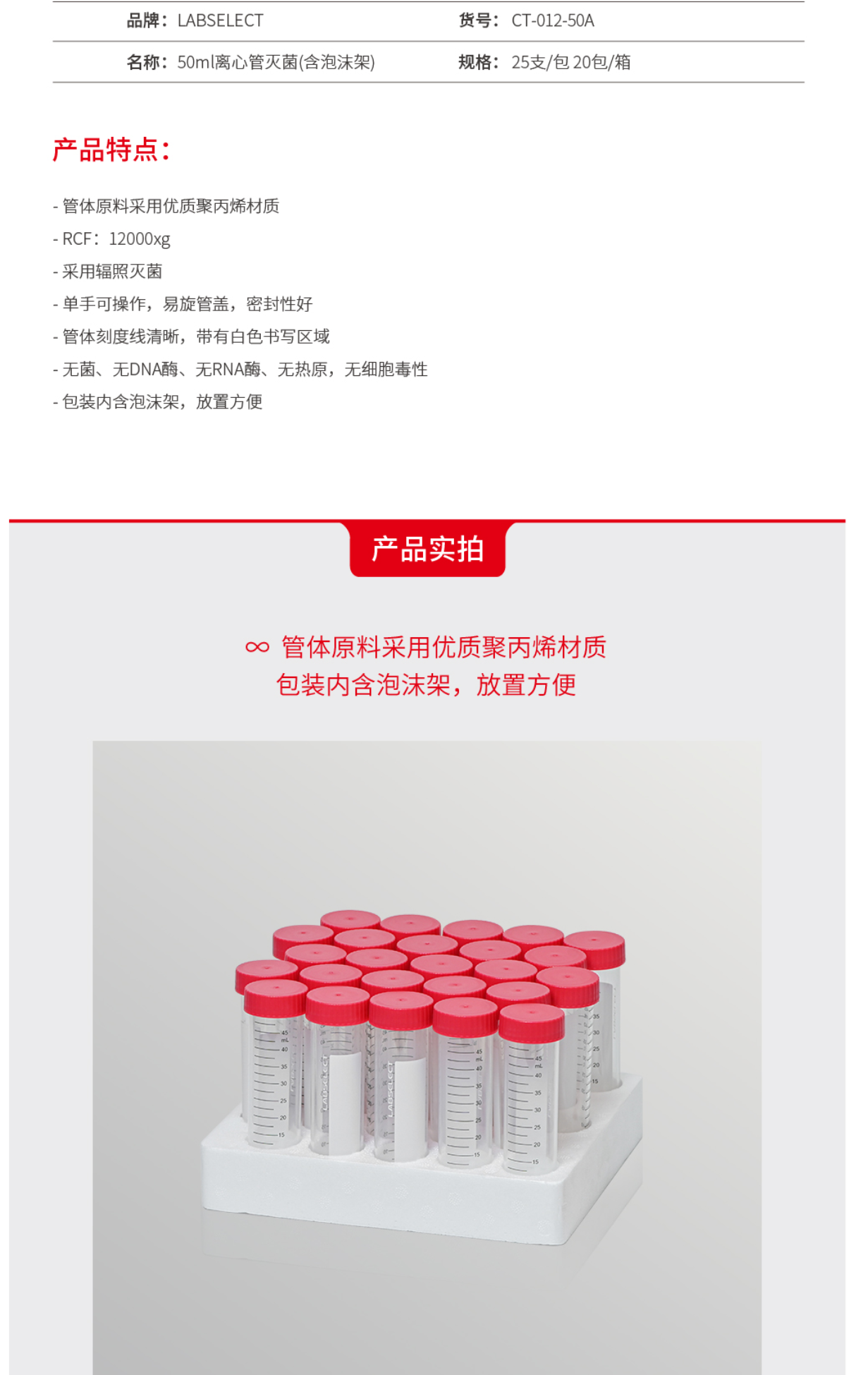 | CT-012-50A | 50ml,灭菌, 含泡沫架 | 包装说明:25支/包,20包/箱 |