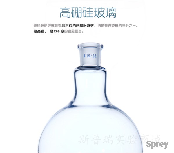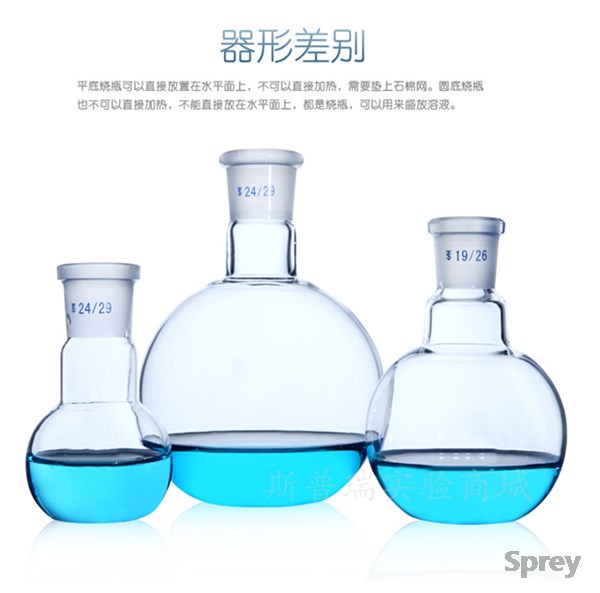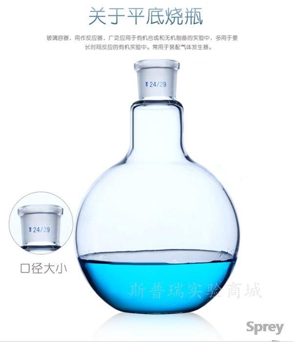 产品描述:单颈,平底烧瓶与外侧接头,厚壁设计,所有型号的瓶子都用玻璃管手工吹制而成,所以球壁厚度厚,且壁厚均匀。它是实验室中使用的一种烧瓶类玻璃器皿,主要用来盛液体物质,可以轻度受热。由于瓶颈短,口较大,可以容纳更多的配套仪器进行较复杂的蒸馏操作,又因口较大,配套仪器的安装亦较为简单。